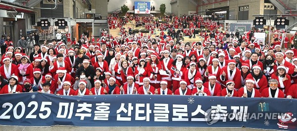 (인천=연합뉴스) 임순석 기자 = 크리스마스인 25일 인천 중구 상상플랫폼에서 열린 '2025 미추홀 산타클로스 축제'에 참석한 자원봉사자들이 기념 촬영하고 있다. 이날 1천여명의 미추홀 산타클로스는 인천지역 소외 계층 2000가정에 겨울 이불, 생활용품 선물 세트, 떡국 밀키트 등으로 구성된 선물 상자를 전달했다. 2025.12.25